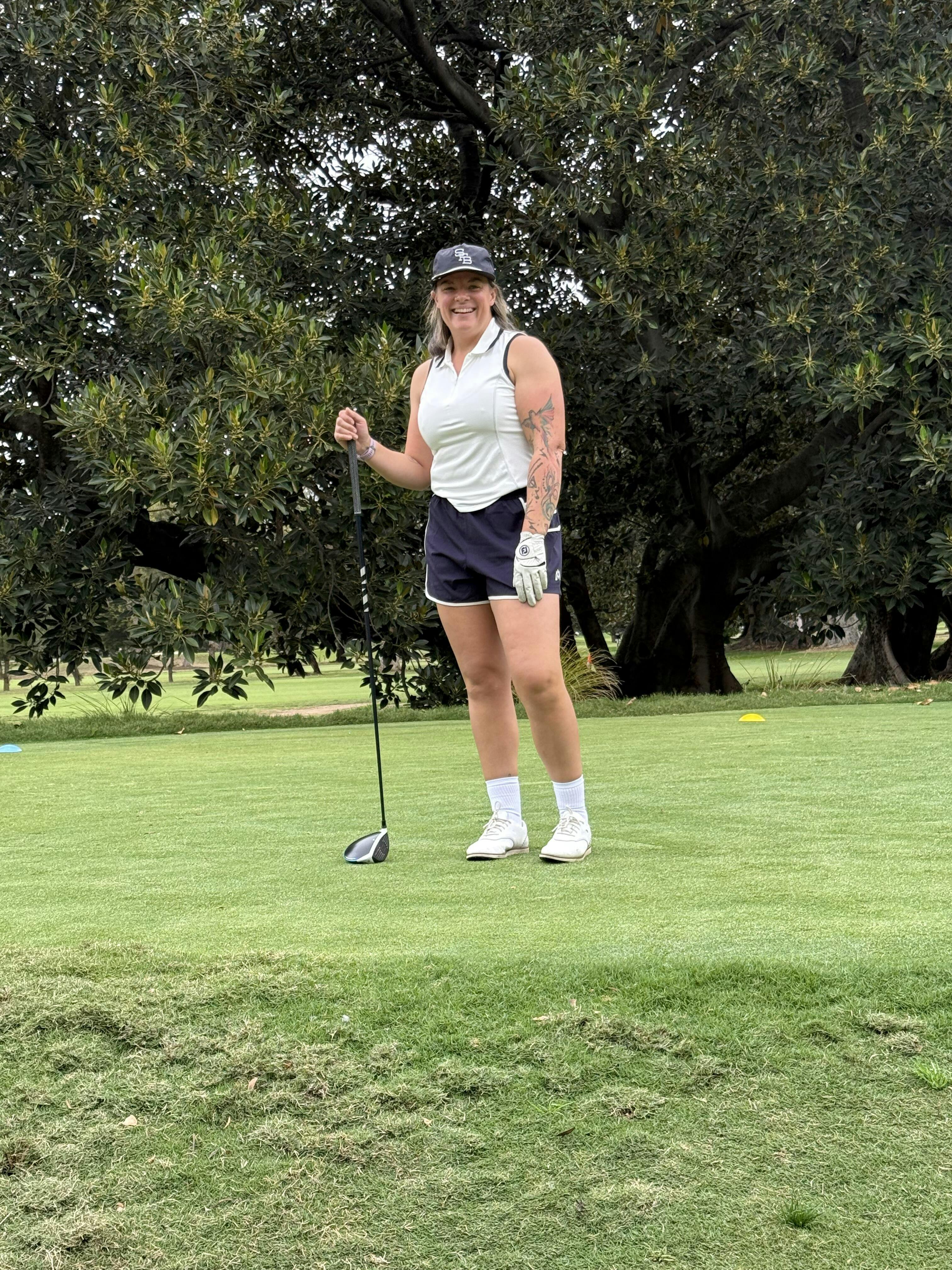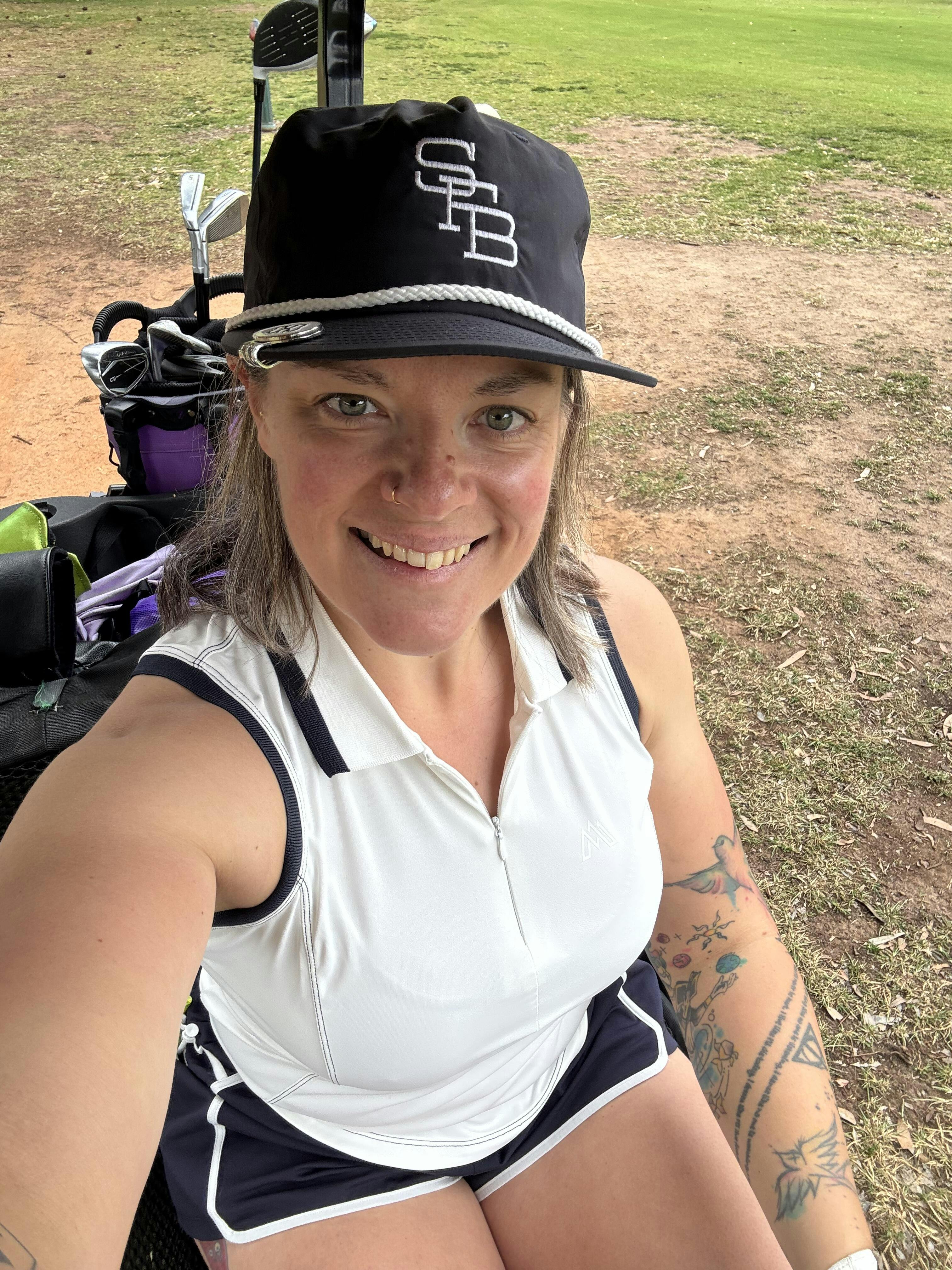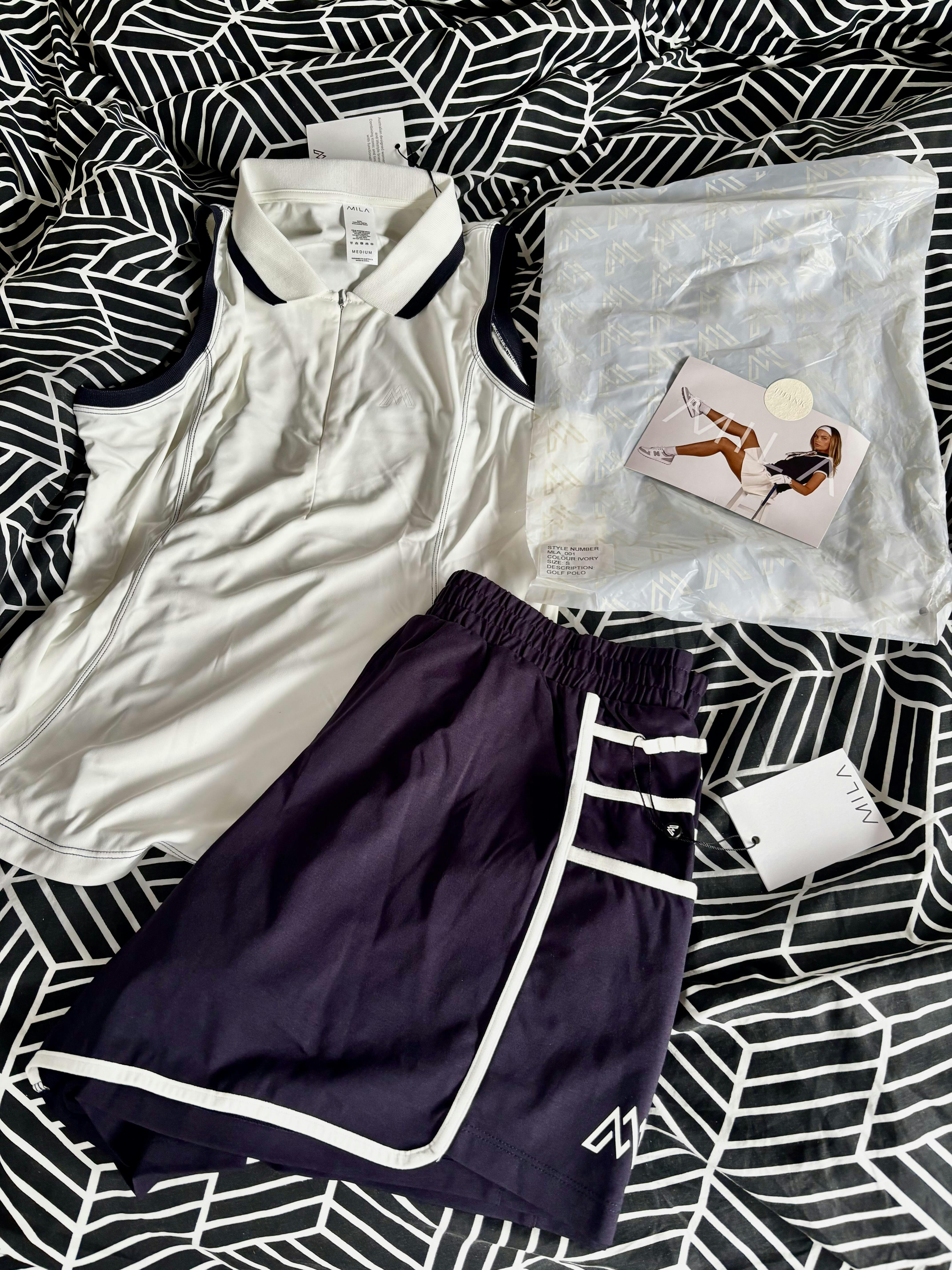 Designed in Ivory White & Navy, it features a flattering tailored silhouette, a zip neckline, and UV50 protection, keeping you comfortable and confident on and off the course.